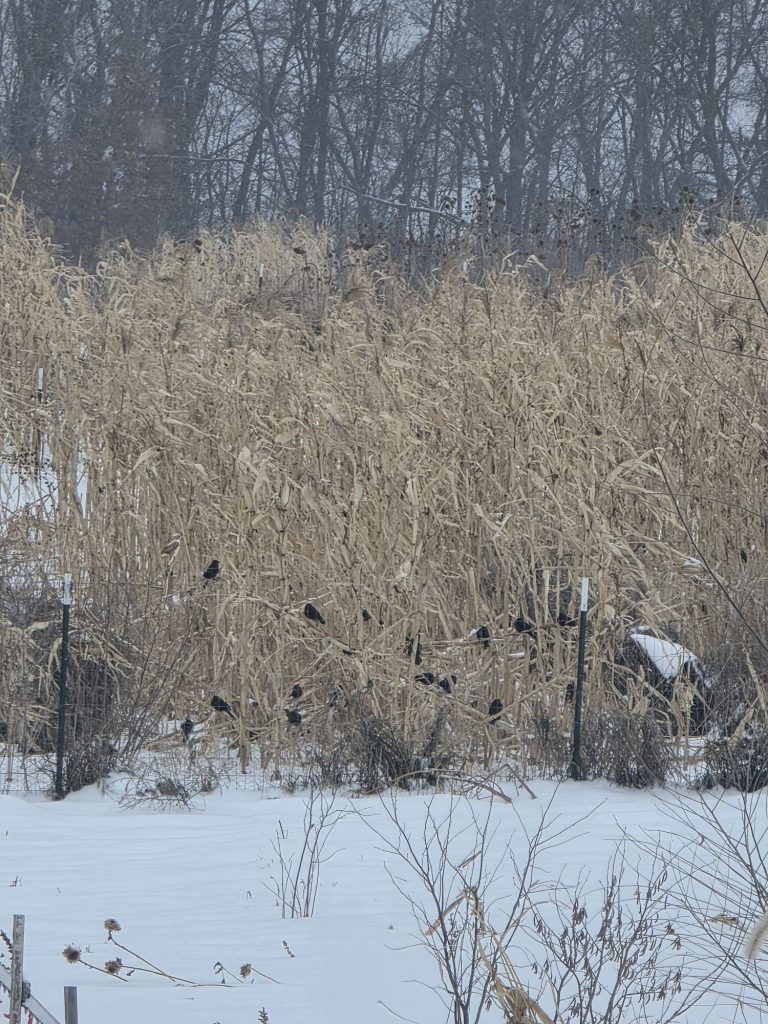 I came home from Florida to sub-zero temperatures in MN last night. This morning looking out the back door of the house towards the resting poultry production paddock I noticed this flock of black birds.