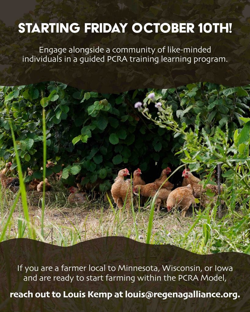 The Regenerative Agriculture Alliance’s Fall Training Cohort is starting soon, October 10th. If you are a farmer local to Minnesota, Wisconsin, or Iowa and ready to start farming within a Poultry-Centered Regenerative Agroforestry Model, reach out to Louis Kemp at louis@regenagalliance.org