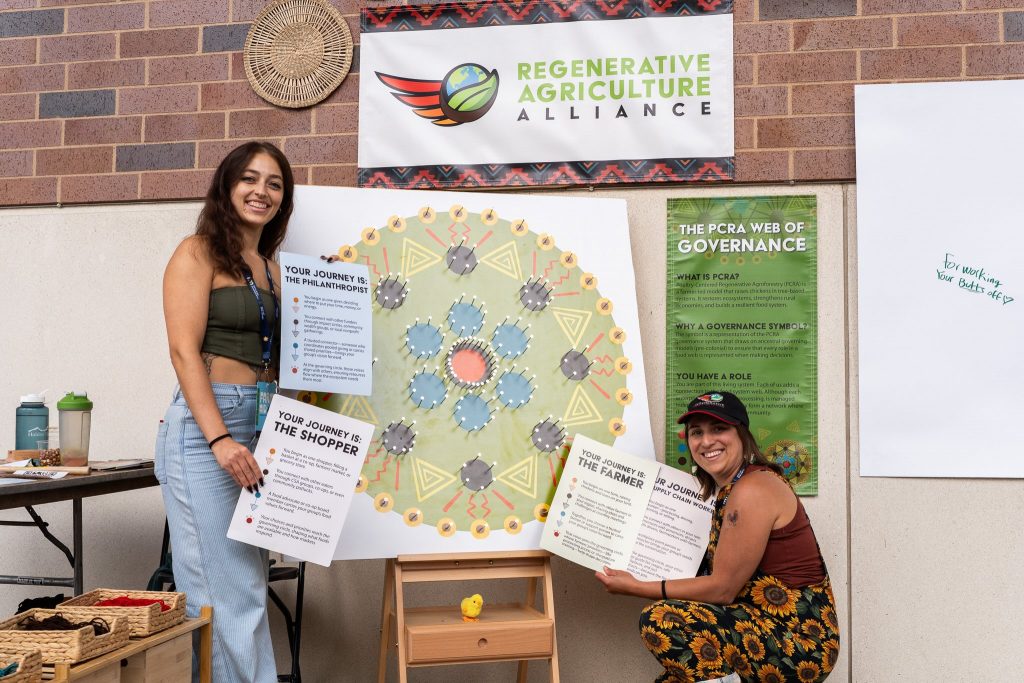 Our team had a wonderful time speaking with festivalgoers and unveiling our newest interactive art piece at the Homegrown Village—an experience that invited participants to weave a regenerative food system journey. Attendees wove food system “persona” journeys over a deconstructed PCRA Governance Symbol (pictured below).