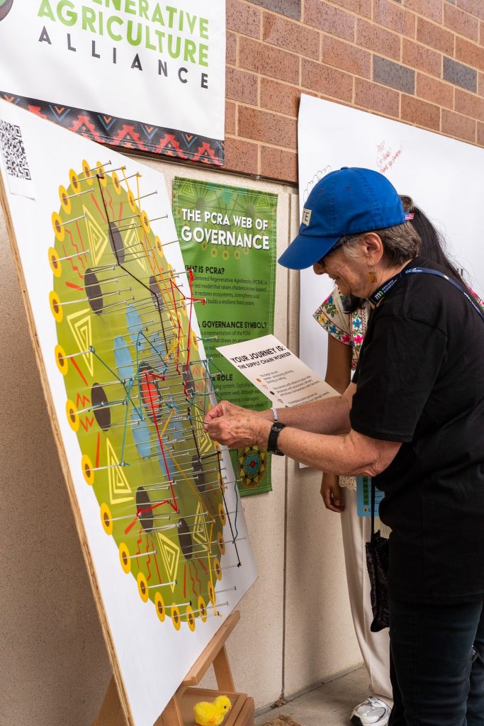 Participants tied yarn to a starting nail on the edge (symbolizing starting as an individual) and wove their way toward the center (where a regenerative governing council is represented), following the journey of a chosen persona (shopper, farmer, etc). Through this process, attendees could see how their role interacts with others in the food system, and by festival’s end, the tapestry reflected the individual journeys of many woven into a collective story.